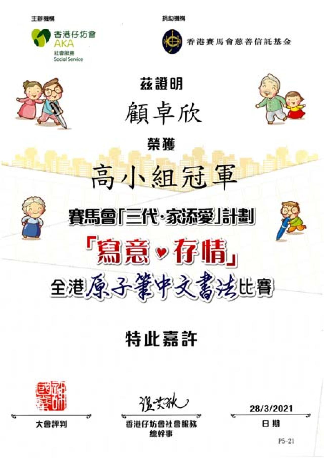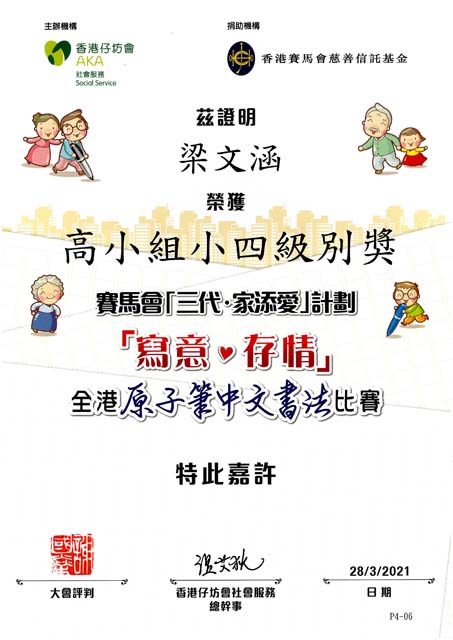 2021-04-29 獎項得獎者高小組 冠軍5A 顧卓欣高小組 小四級別獎4A 梁文涵入圍證書4A 李倩兒4A 袁駿熙4A 梁文涵4A 黃娉婷5A 鄭妙如5A 黄宇俊5A 黃寶燕5A 劉美伶5A 顧卓欣 校外獎項