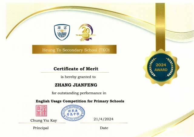 2024-05-09 獎項得獎者 Merit 5A 張建鋒Participation 4A 劉嘉敏4A 劉叡謙4A 李藹桓4A 莫子迪5A 區棕元5A 張穎恩5A 徐曉瀅5A 蘇楷雋6A 姚涵韵6A 葉海欣6A 袁迪恩 校外獎項
