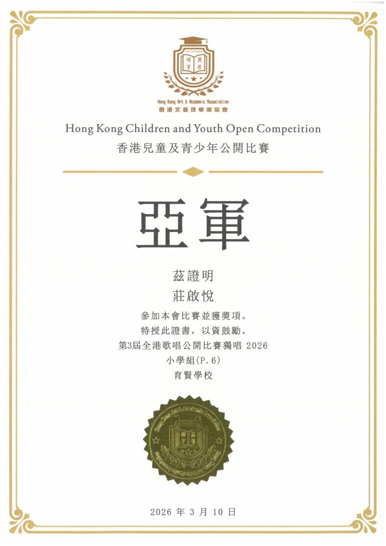 第三屆全港歌唱公開比賽獨唱2026 小學組