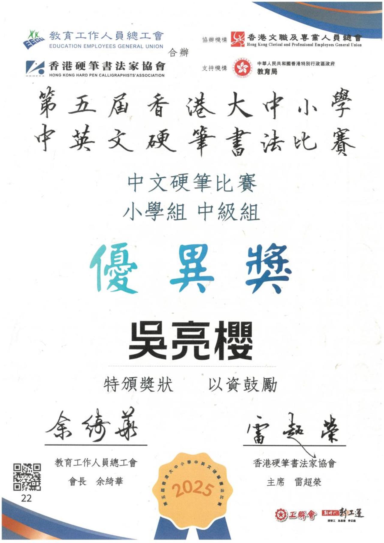 第五屆香港大中小學中英文硬筆書法比賽
